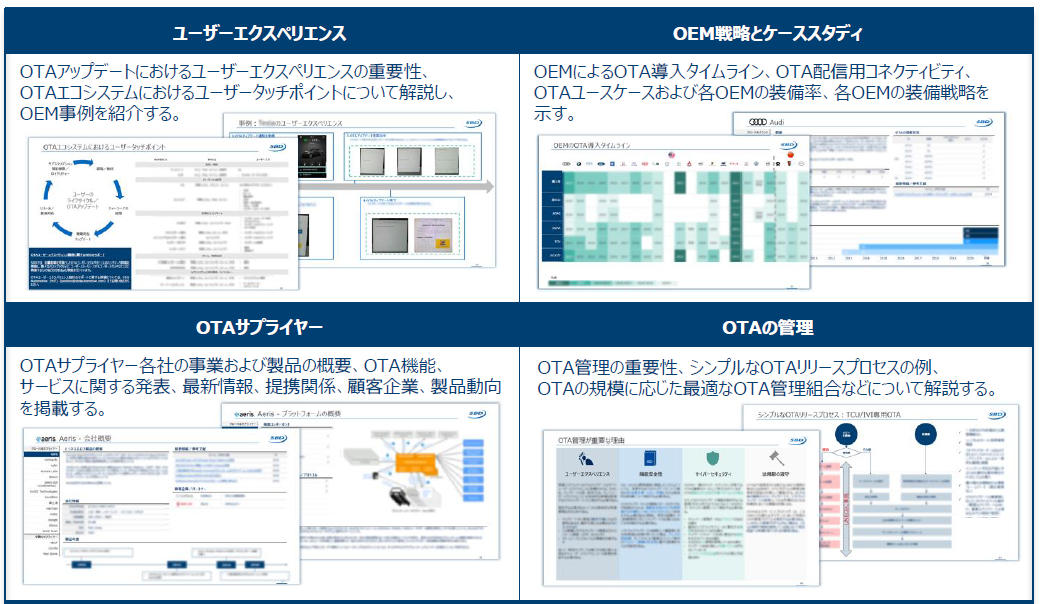 本書では、OTAアップデートが今後の自動車業界にもたらす影響と展望について考察、OEMおよびサプライヤーの現在の活動と今度の動向予測を紹介すると同時に、法規制や業界団体の動向、全般的なリスク、予測、および市場動向についての洞察を掲載しています。