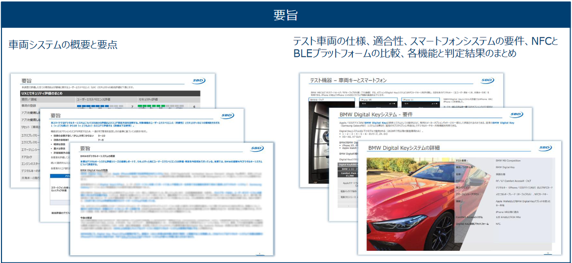 SBDはこの数年、スマートフォンキーシステム(現在はデジタルキーシステムと呼ばれるのが一般的)に焦点を当てた一連のレポートを発行してきました。今回の調査ではBMWの一部車種で提供されている最新システムについて詳しく説明しています。BMW Digital Keyと呼ばれるこのシステムはNFC通信に対応し、Apple iOS製品での使用を想定して設計されたものです。今回は本レポートシリーズとして初めてシステムセキュリティとともにユーザーエクスペリエンス(UX)のレーティング評価を行っています。
