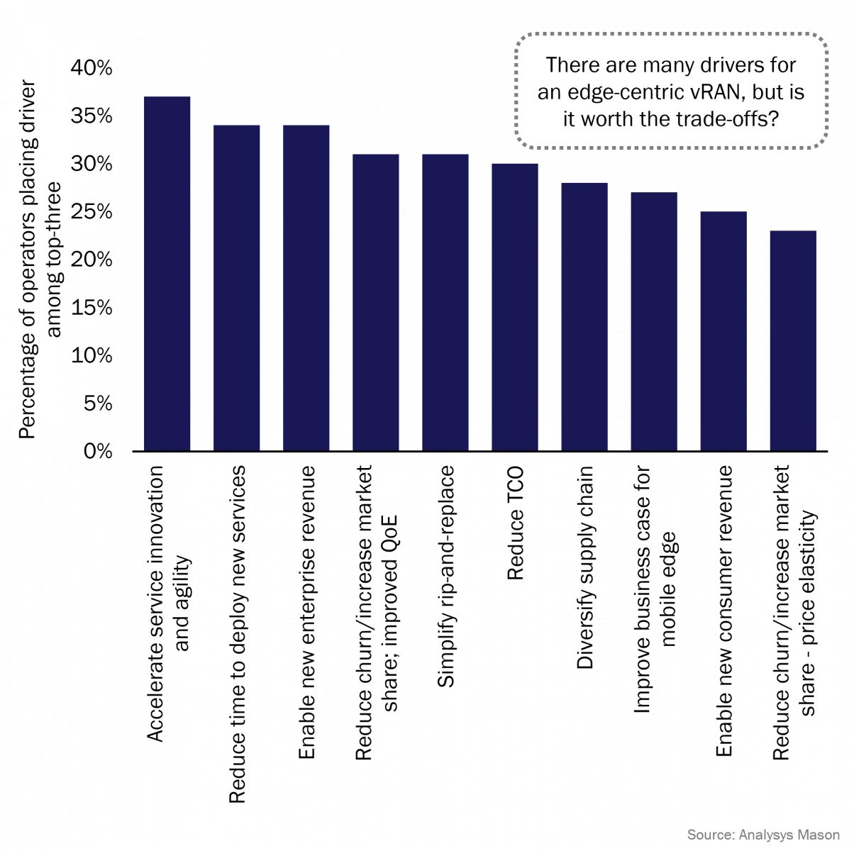 Top-three drivers for operator adoption of an edge-centric vRAN or Open RAN, worldwide, 2Q 2022