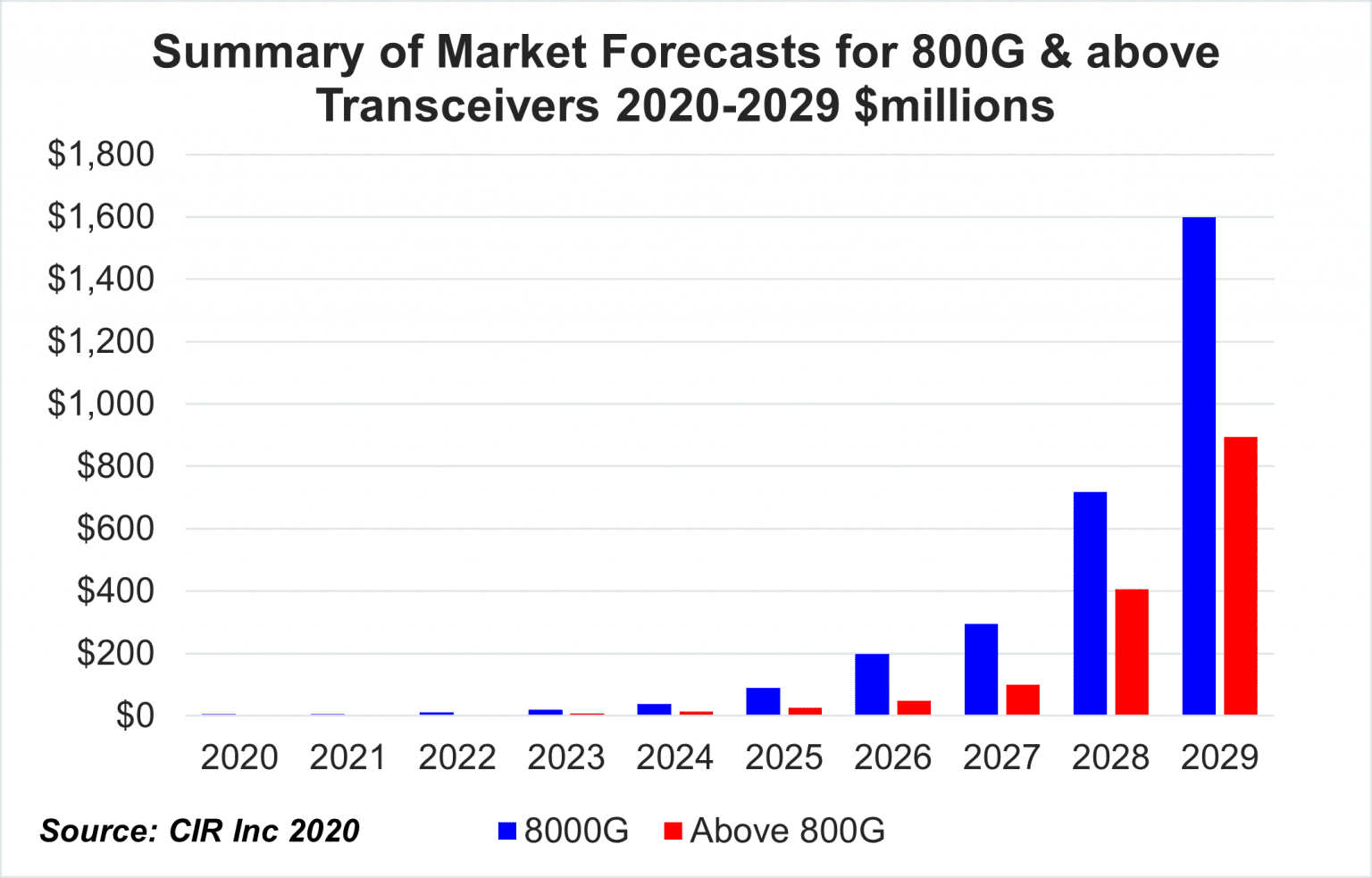 Communications Industry Researchers (CIR), has published a new report stating that the market opportunity for 800 Gbps transceivers (800G) and above will reach $245 million in revenues by 2025 with ramp up to $2.5 billion by 2029. Driven initially by video, CIR expects the traffic in data centers will be further driven by 5G and IoT applications requiring data center infrastructure to be rebuilt using 800G interfaces.