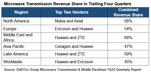 Press ReleaseThe Microwave Transmission market posted another strong quarter of year-over-year growth in 1Q25. This quarter’s increase marks the second consecutive quarter of positive year-over-year growth, which began at the end of 2024. Similar to the fourth quarter of last year, the 1Q25 market improvement was driven by the higher demand for mobile backhaul (MBH) equipment in emerging regions of the world, especially India, the Middle East, and Africa. We estimate the year-over-year growth in these parts of the world was 82%, 21%, and 26%, respectively. The top six vendors in 1Q25, based on the order of highest worldwide revenue share to lowest, were Huawei, Ericsson, ZTE, Ceragon, Aviat, and Nokia. Both Huawei and Ericsson continued to hold their top spots in the quarter, while ZTE jumped to the third-highest share due to the company’s success in winning new awards in the Middle East and Africa region. With recent market consolidation, vendor concentration has increased in the Microwave Transmission market. The figure below displays the top two suppliers for each major region, along with their combined market share for the trailing four-quarter period (2Q24 through 1Q25). Note that Huawei is a top supplier in four regions, and ZTE is a top supplier in two regions, while the other vendors are listed in only one region. Microwave Transmission Revenue Share in Trailing Four Quarters About the Report The Dell’Oro Group Microwave Transmission & Mobile Backhaul Quarterly Report offers complete, in-depth coverage of the market with tables covering manufacturers’ revenue, ports/radio transceivers shipped, and average selling prices by capacities (low, high, and E/V Band). The report tracks point-to-point TDM, Packet, and Hybrid Microwave as well as full indoor and full outdoor unit configurations.