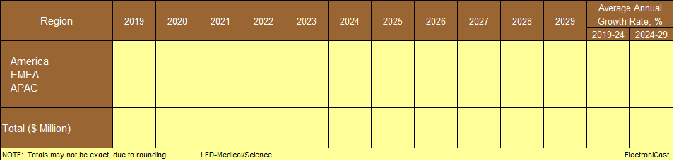 This study is based on analysis of information obtained continually over the past several years, but updated through early April 2020. During this period, ElectroniCast analysts performed interviews with authoritative and selected representative individuals in the following sectors relative to the use of LEDs: medical, science, bio-photonic, display industry, test/measurement, instrumentation, R&D, university, military defense/space and government. The interviews were conducted principally with:
