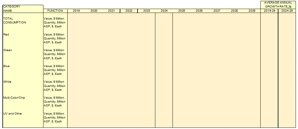 At each database level, the ElectroniCast estimates and forecast for packaged LEDs is built from the bottom up, segmented by color–type, arranged in a hierarchy, of the end-user types (applications) that use devices that the LEDs are used in, and arranged in a hierarchy and summed upward. The estimates and forecast for each LED color-type in each region is in terms of quantity (unit/each), value (US$ Million) and average selling price.