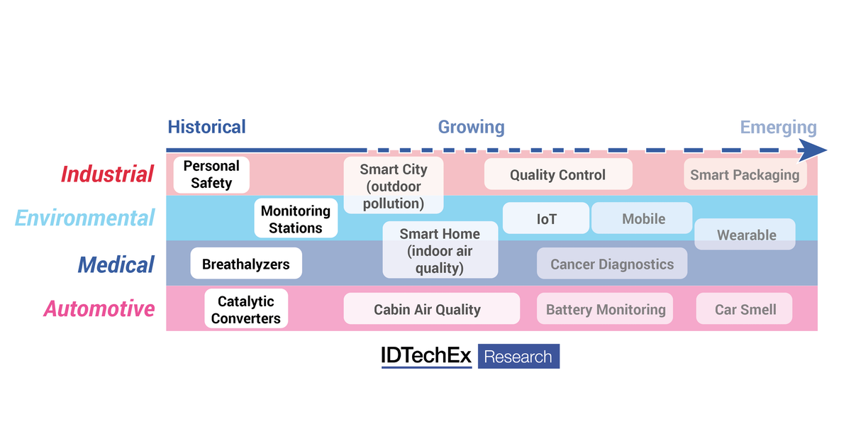 Gas sensors are simultaneously an established industry and well placed to benefit from the trend towards mass-digitization. Interest from consumers and policymakers in air quality has increased dramatically due to COVID-19, creating a growing market for distributed gas sensor networks. Through discussions with major and emerging sensor manufacturers, along with analysis of early-stage technologies, this report identifies opportunities and challenges across environmental, medical, automotive, and olfaction markets.