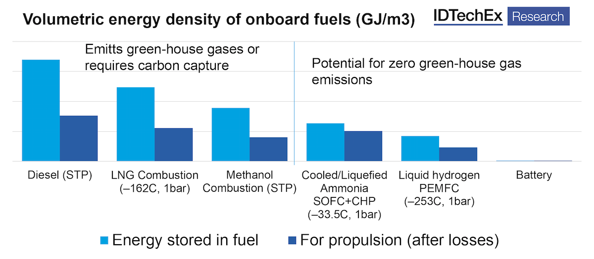 However, PEMFC use expensive materials such as platinum, and hydrogen is difficult to transport and store. As a liquid, the chart shows how hydrogen requires much more space than alternative fuels whilst also requiring a storage temperature of minus 253C. This makes it difficult for PEMFC, which can only be powered by high-purity hydrogen, to fully decarbonize the marine sector. Nonetheless, IDTechEx expects applications to grow rapidly in inland or coastal sectors where there will be more frequent refueling opportunities.