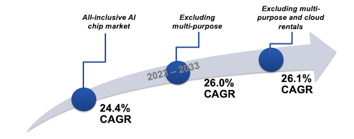 Just as computer graphics required a different type of chip architecture, so the emergence of machine learning has brought about a demand for another type of accelerator, one that is capable of efficiently handling machine learning workloads. This report details the differences between CPU, GPU and Field Programmable Gate Array (FPGA) architectures, and their relative effectiveness with handling machine learning workloads. Application-specific Integrated Circuits (ASICs) can be effectively designed to handle specific workloads, with the architectures of several of the world's leading designers of ASICs for AI being analyzed in this report. The need for chips capable of handling ML workloads will only increase as the benefits for consumers (increased functionality in consumer electronics, more accurate image classification and object detection in security cameras, and low latency, high-precision inference in autonomous vehicles, for example) is realized, which is reflected in the forecast compound annual growth rate (CAGR) of 24.4% for AI chips (including those that are used for other purposes in addition to handling ML workloads, as well as chips accessible through a cloud service) between the years 2023 and 2033.