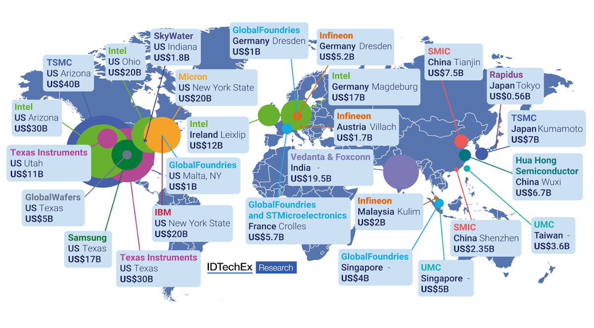 Shown here are the proposed and confirmed investments into semiconductor facilities by manufacturers since 2021. Where currencies have been listed in anything but US$, these have been converted to US$ as of publication date. Source: IDTechEx