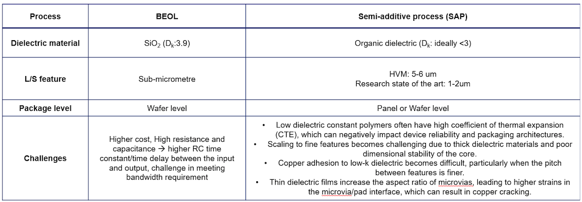 Delving deeper into achieving higher wiring density and a higher bit rate per I/O from a materials and processing perspective reveals the critical role played by the selection of dielectric materials and the utilization of appropriate processing techniques. These factors have a significant impact on the overall performance and capabilities of the packaging system.
