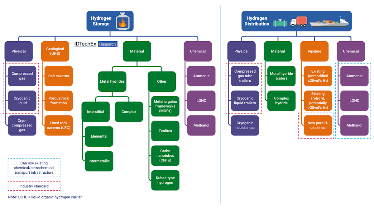 Overview of hydrogen storage & distribution methods covered in the report. Source: IDTechEx