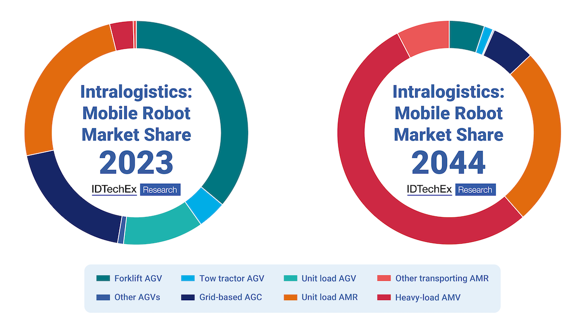 The market share of various AGVs and AMRs in intralogistics - 2023 versus 2044