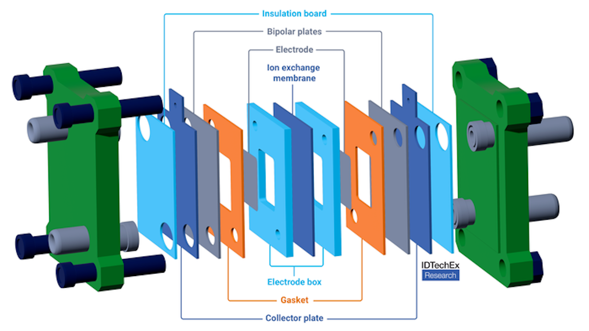 However, there are some factors limiting the rate of RFB deployments in the current stationary energy storage market. Firstly, while RFBs present a lower LCOS than Li-ion, the CAPEX per kWh of the most widely deployed RFB, the vanadium RFB (VRFB), is higher. This will naturally act as a blocker for stakeholders looking to deploy energy storage technologies for grid-scale applications where CAPEX is already expected to be in the tens- or hundreds-of-millions of dollars for Li-ion. The cost of VRFBs is limited by expensive vanadium electrolyte, as this comprises ~30-50% of unit cost. Other substantial costs come from materials and components in the cell stack (see below) including the membrane, bipolar plates, electrodes, gaskets, etc. VRFB cost reductions are only likely to come in the longer term and from increasing economies of scale, as well as improved and more automated manufacturing processes.