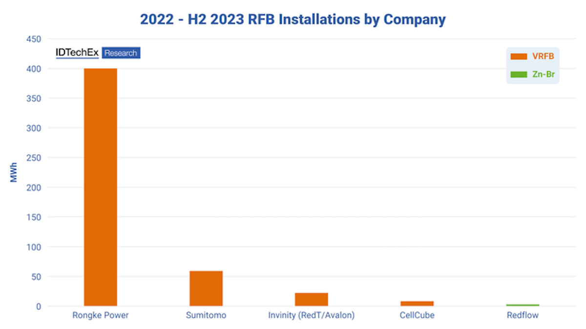 While other RFB technologies may compete, there are far fewer companies developing any one of these specific RFB chemistries. For instance, the only companies developing all-iron, H-Br or H-Mn RFBs are ESS Inc, Elestor and RFC Power, respectively. Therefore, it is more likely that most RFB capacity installed globally will be from vanadium RFBs over the next few years, as 18 companies identified by IDTechEx are developing these systems. Of the key players identified, Rongke Power's large 400 MWh VRFB installation dwarfs all installations made by other players over the past decade. In 2022, Sumitomo Electric Industries installed a 51 MWh VRFB in Japan, and another notable player, Invinity, installed ~22 MWh of VRFBs across various locations in the UK, US, Canada, South Korea and Taiwan. CellCube also made some smaller installations. The only company to make non-VRFB installations in 2022 was Redflow, with their Zn-Br RFB technology, but these only accumulate to ~3 MWh installed in 2022. This IDTechEx report includes market analysis, including RFB player announcements, supply partnerships, company and chemistry market shares, historical RFB installations by region since 2010, and planned projects and production facilities.