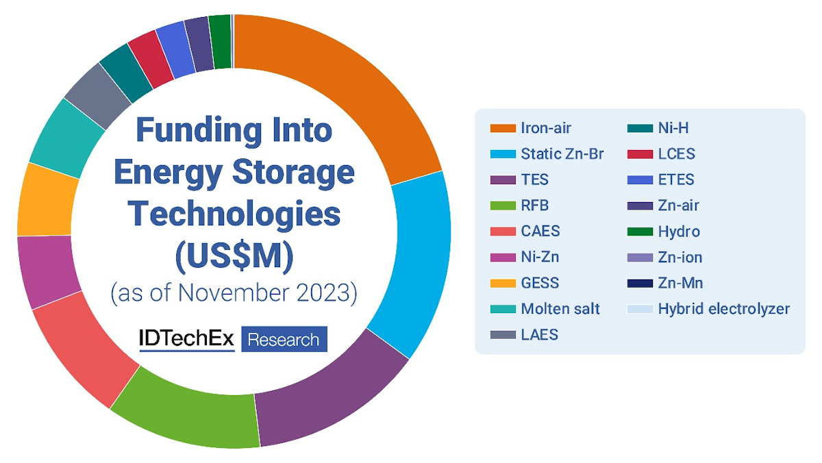 Funding into energy storage technologies (US$M) as of November 2023. Source: IDTechEx.