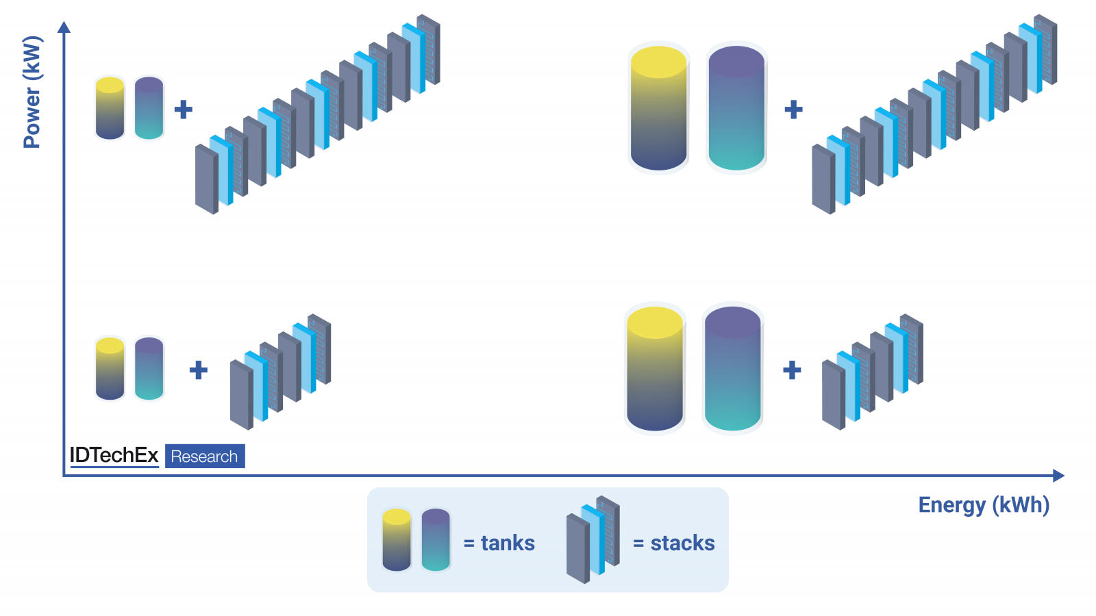 Decoupling of energy capacity and power in redox flow batteries (left), and reductions in CAPEX ($/kWh) (right). Source: IDTechEx.