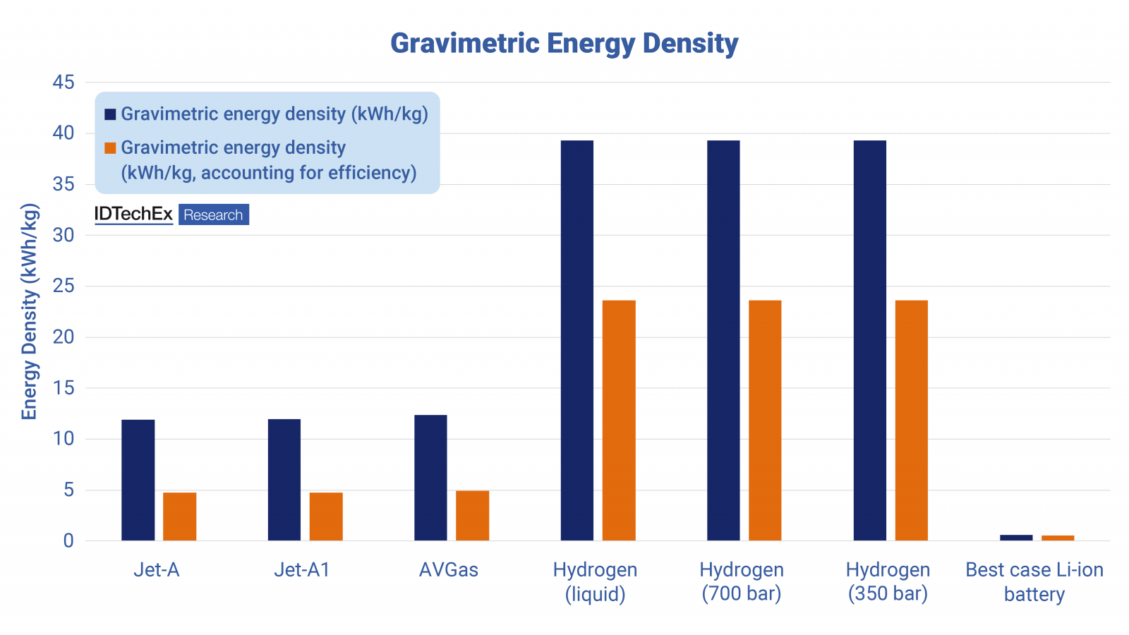 水素のエネルギー密度は39.3kWh/kgで、ジェット燃料の3倍、現在のリチウムイオン電池の100倍以上である。水素の体積制限が理解されるまでは、これは非常にエキサイティングなことだ。液体であっても、水素は同じエネルギーに対してジェット燃料の4倍近い体積を占める。制限となるのは、航空機に十分な貯蔵容積を確保することである。また、液体であり続けるためには極低温で冷却する必要があり、気体として有用な体積エネルギー密度を持つためには加圧する必要があることも制限となっている。このような制約があるにもかかわらず、本レポートでは、水素を戦略的に利用することで、大きな航空需要を満たすことができることを説明する。