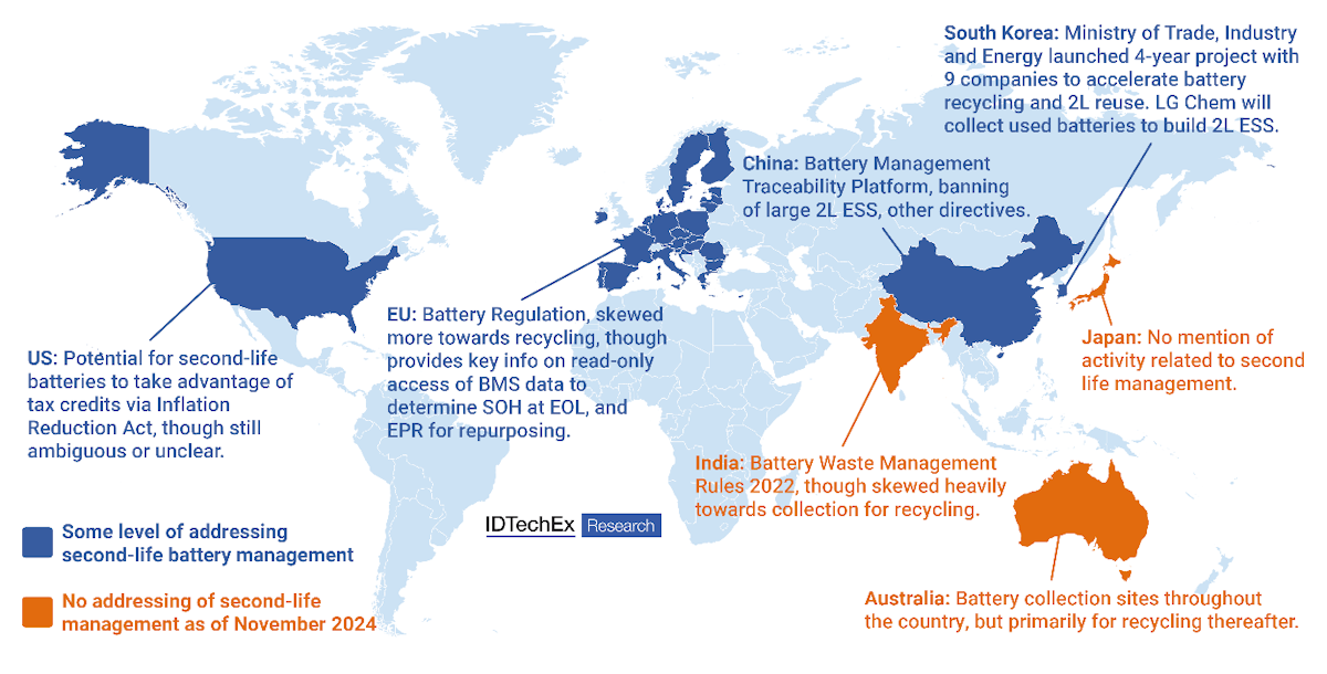 Second-Life EV Battery Legislative Activity by Region. Source: IDTechEx.