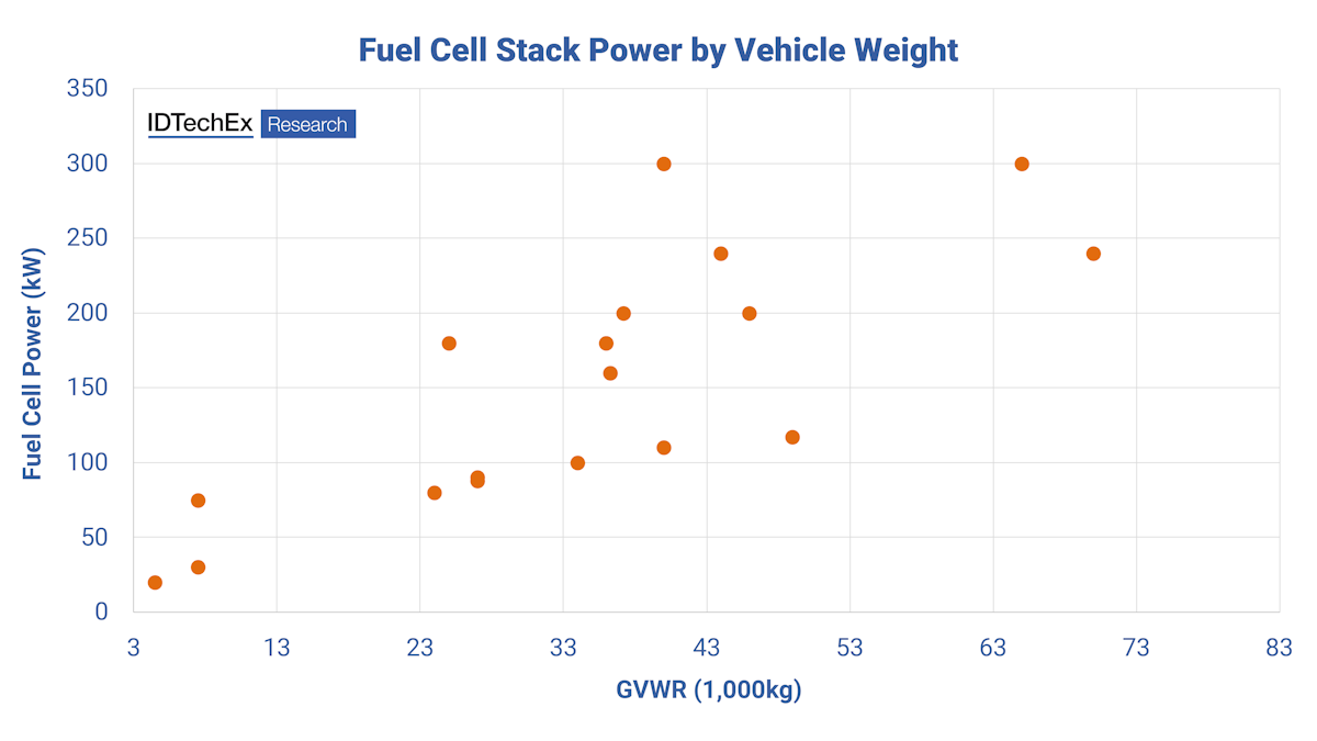 Relationship between gross vehicle weight rating (GVWR) of an FCEV and the power of the fuel cell stack required. Full data is available in "Fuel Cell Electric Vehicles 2025-2045: Markets, Technologies, Forecasts".