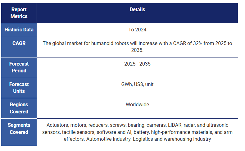 結論 ヒューマノイドロボットは産業界への導入がまだ初期段階にあるとはいえ、特に自動車やロジスティクスの分野において、その市場潜在力は非常に大きい。多額の投資、技術の進歩、スケールメリットの増大により、今後10年間の急成長が期待される。IDTechExは、ヒューマノイドロボットの市場規模は2035年までに約300億米ドルに達するとみている。詳細はIDTechExの最新リサーチ「ヒューマノイドロボット2025-2035」に掲載されている:技術、市場、機会」をご覧ください。 主要な側面 本レポートは、ヒューマノイドロボットに関する重要な市場情報を提供し、その主な用途と各構成要素の技術的、規制的、商業的課題に焦点を当てています。内容は以下の通りです: 最先端のヒューマノイドのレビュー、対象産業、採用スケジュール