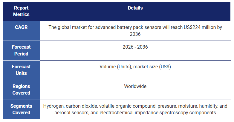 本レポートは、先進センサー技術のバッテリーパックへの統合に関する詳細な市場情報を提供するもので、予測では8種類のセンサーを詳細に取り上げ、さらに多くのセンサーをベンチマークとしている。これには以下が含まれます: