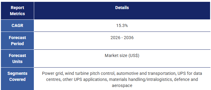 この報告書は、スーパーキャパシター市場に関する洞察と市場情報を提供し、3種類のスーパーキャパシター(電気二重層スーパーキャパシター、疑似キャパシター、ハイブリッドスーパーキャパシター)を含む市場動向を分析しています。予測期間は2026年から2036年までの10年間を対象とし、スーパーキャパシターに関するこれまでで最も包括的な市場分析を提供しています。自動車/輸送、電力網、無停電電源装置(UPS)を含む7つの市場セグメントをカバーしています。例示製品と主要企業の分析も含まれています。