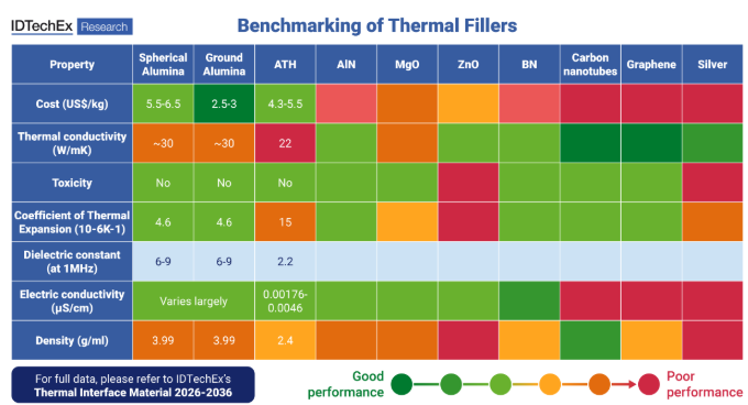 TIM(熱伝導材)は、ペースト、パッド、液体/固体金属、グラフェンシート、フィルムなど、多様な形態で存在します。TIMは通常、ポリマーマトリックス内に高導電性の充填材を含有しています。TIMの特性(例えば熱伝導率、コスト、粘度など)は、充填材の種類、粒子サイズ、充填率、粒子形状など、多くの要因に大きく依存しています。代表的な充填材には、アルumina、アルumina水酸化物(ATH)、AlN、ボロンニトリド(BN)、ZnO、MgOなどが挙げられます。さらに、銀、グラフェン、カーボンナノチューブ充填材など、より高度なTIM充填材も存在します。コスト、地域規制、充填材の処理難易度、摩耗性など、多くの要因により、業界や用途に応じて最適な充填材は異なります。このTIM報告書には、充填材の技術的・コスト分析に加え、コスト(US$/kg)、熱伝導率(W/mK)、毒性、熱膨張係数(CTE)、絶縁強度、電気伝導率、密度、その他の要因に基づく充填材のベンチマーク比較が含まれています。