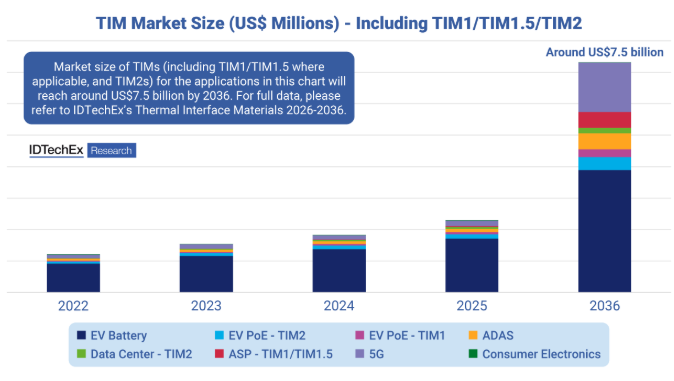 要約すると、本報告書は、熱伝導材料(TIM1、TIM1.5、TIM2およびTIM充填材)に焦点を当てた包括的な市場調査報告書であり、多様な応用分野に加え、異なる応用分野における10年間の市場規模と面積の予測を含んでいます。IDTechExは、TIMの市場規模が2036年までに約75億米ドルに達すると予測しています。