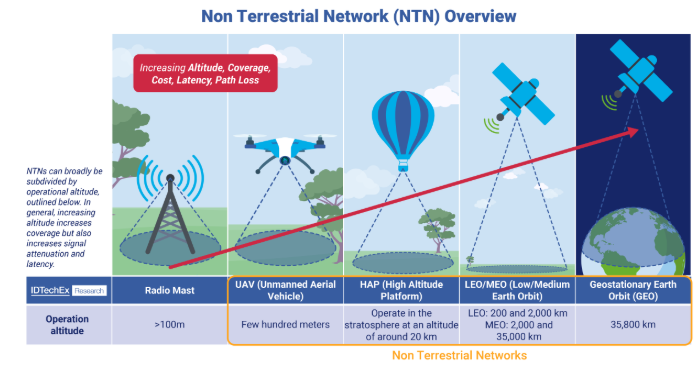 NTNには様々な技術があり、それぞれに利点、課題、応用がある。本レポートでは、これらの技術の6G D2Cへの適用可能性について検討する。出典IDTechEx.