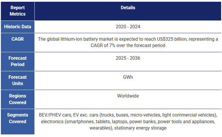本レポートは、世界のリチウムイオン電池市場を概観し、4つの主要市場分野(バッテリー電気自動車、電気自動車、エレクトロニクス、定置型エネルギー貯蔵)と、すべての主要セルコンポーネントをカバーしている。