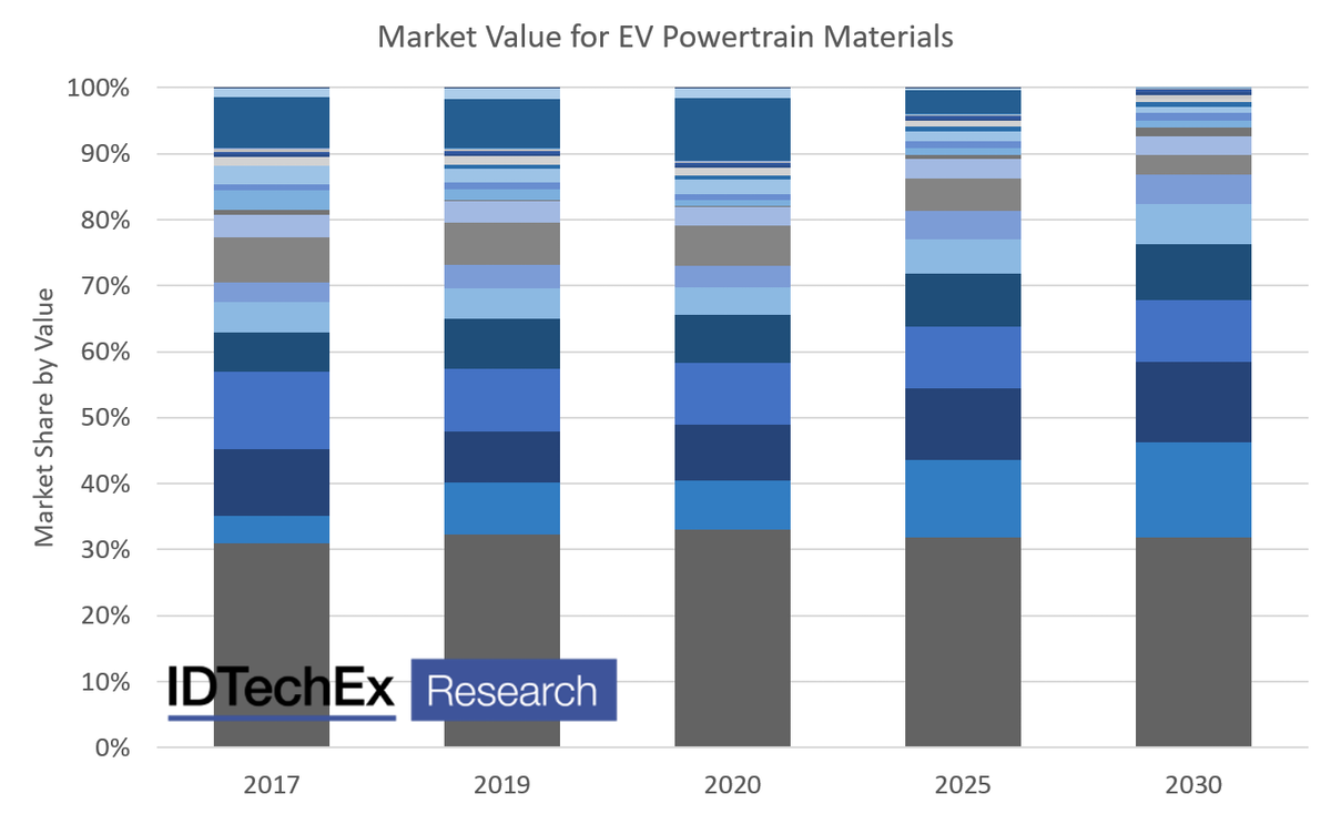 IDTechEx forecasts over 28 materials used in the construction of electric vehicle powertrains, each with shifting market shares. A rapid increase in demand is seen across several material markets after a small drop in 2020 due to COVID-19 implications for the automotive market. Source: IDTechEx report, Materials for Electric Vehicles 2020-2030.