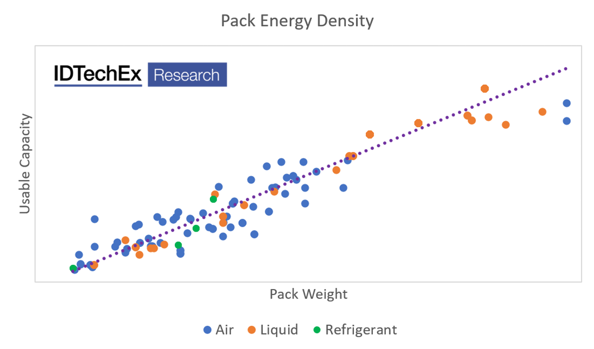 IDTechEx considered over 150 battery-electric and plug-in hybrid cars sold between 2015-2019 to show trends in energy density by thermal management strategy and by year. Full data available in IDTechEx report, Materials for Electric Vehicles 2020-2030.