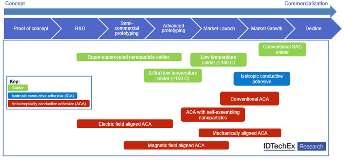 ECAs are not a perfect technology, however. Drawbacks include high costs compared with other joining technologies, primarily due to high materials and processing costs, as well as a lack of self-alignment for components. This can make them unsuitable for certain applications, such as cost-sensitive applications where fine pitch is not required, or applications where ease of repair is desirable, such as hobbyist use. It is likely that no single conductive joining technology will win out in future, although IDTechEx believes that ECAs will become increasingly important over the next decade.