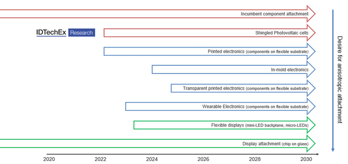 Some key benefits of using an ECA are the fine pitch capacity, the low processing temperature, and the high flexibilities which can be achieved. These benefits make ECAs well suited to making smaller electronics and allow for use on a wider variety of substrates than alternative technologies, such as lead-free solders and silver sintering. Driven by these benefits, IDTechEx forecasts that the market for ECAs is growing, with ECAs set to replace outdated and poor performing competitors across a range of applications, including displays, consumer electronics and wearable technology.