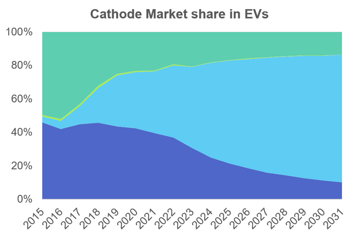 Market share of Li-ion cathodes for electric vehicles. Forecast data available in the report. Source: IDTechEx