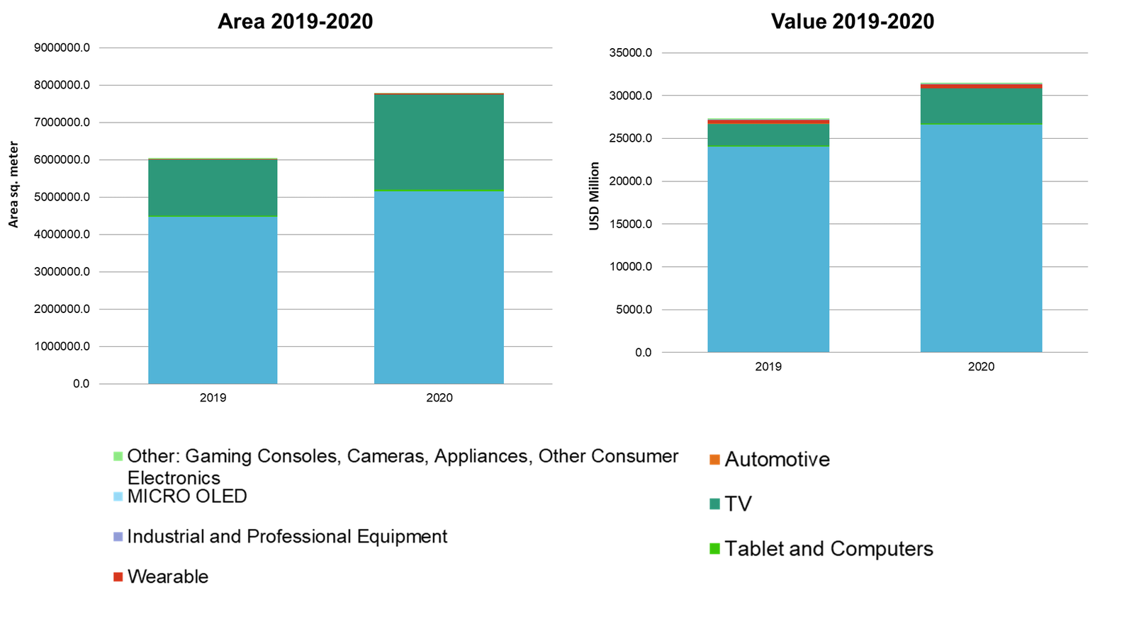 OLEDs for cellphones dominate the OLED sector, comprising of 78% of the OLED market revenue in 2020. The second largest sector are OLED TVs which are 17% of the total market by revenue in 2020. Despite being 17% of the revenue, OLED TVs are 43% of the OLED market by area of display. The third largest OLED application is wearables, which is 2% of the total OLED display market value and 0.3% by area in 2020. The thinness, flexibility and appearance of the display are desirable in may wearable applications versus LCDs.