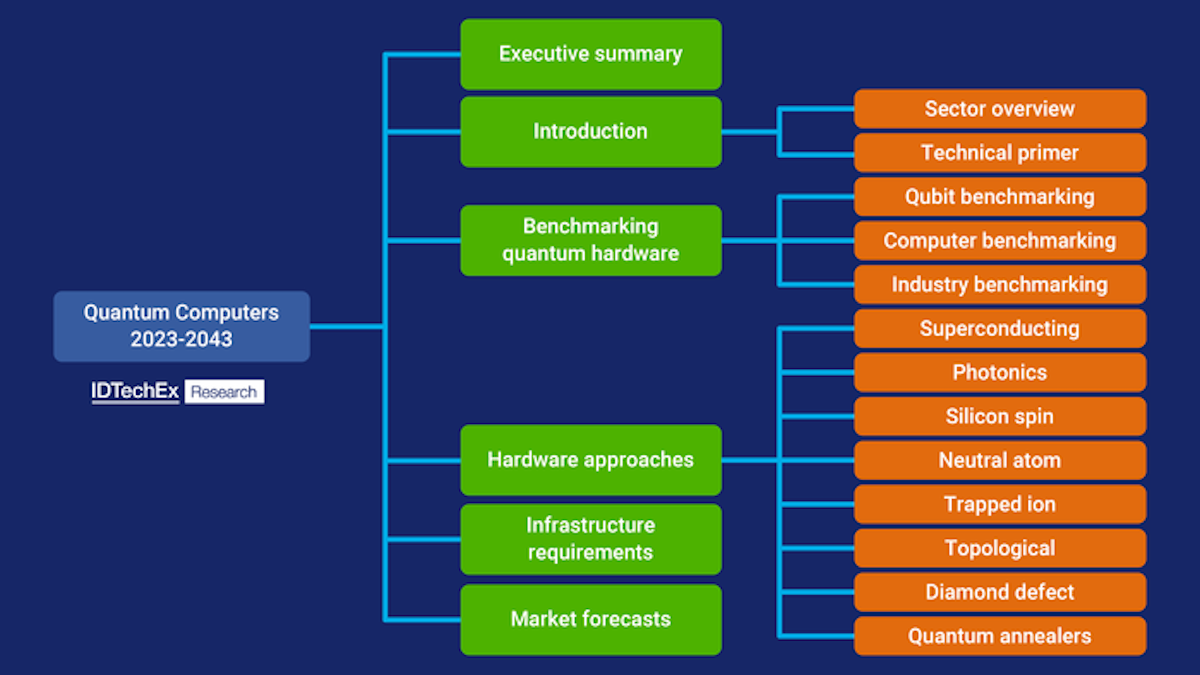 IDTechEx's report 'Quantum Computing 2023-2043' covers the hardware that promises a revolutionary approach to solving the world's unmet challenges. Quantum computing is pitched as enabling exponentially faster drug discovery, battery chemistry development, multi-variable logistics, vehicle autonomy, accurate asset pricing, and much more. Drawing on extensive primary and secondary research, including interviews with companies and attendance at multiple conferences, this report provides an in-depth evaluation of the competing quantum computing technologies: superconducting, silicon-spin, photonic, trapped-ion, neutral-atom, topological, diamond-defect and annealing.