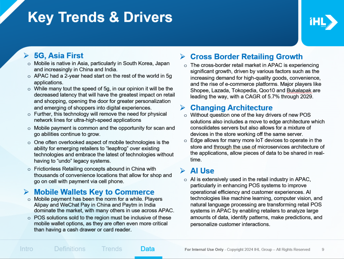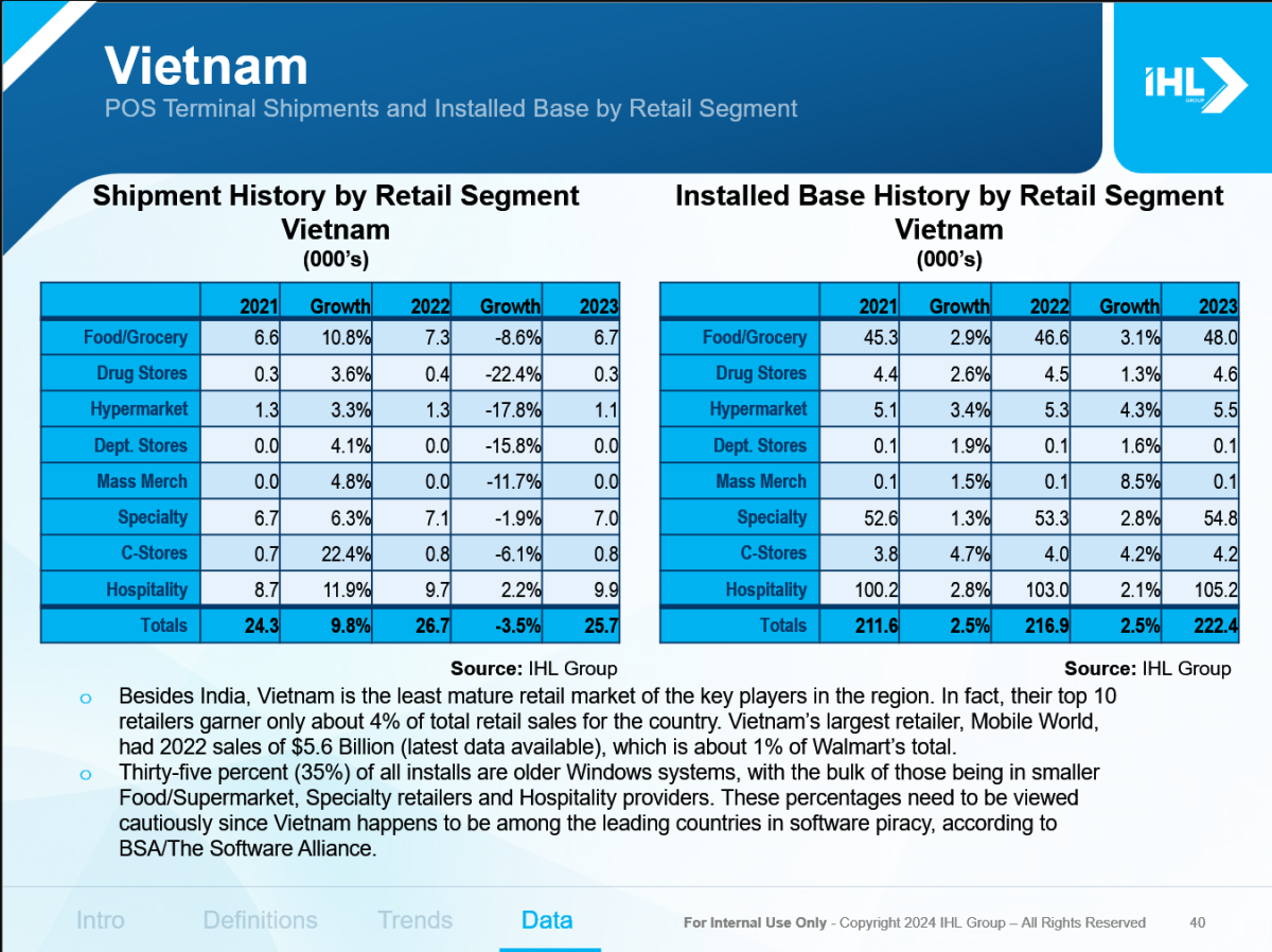 For Distributed Licenses, if applicable, the research can be shared with prospective customers and potential institutional investors. It cannot be shared with partners or other vendors who should be purchasing their own licenses. Table of ContentsTable of Contents INTRODUCTION 1. TRENDS/BARRIERS 2. ASIA/PACIFIC MARKET OVERVIEW 2.1 POS Shipment History 2.2 POS Installed Base History 3. JAPAN 3.1 Retail Overview 3.2 POS Shipment History 3.3 POS Installed Base History 4. CHINA 4.1 Retail Overview 4.2 POS Shipment History 4.3 POS Installed Base History 5. INDIA 5.1 Retail Overview 5.2 POS Shipment History 5.3 POS Installed Base History 6. AUSTRALIA / NEW ZEALAND 6.1 Retail Overview 6.2 POS Shipment History 6.3 POS Installed Base History 7. SOUTH KOREA 7.1 Retail Overview 7.2 POS Shipment History 7.3 POS Installed Base History 8. VIETNAM 8.1 Retail Overview 8.2 POS Shipment History 8.3 POS Installed Base History 9. TAIWAN 9.1 Retail Overview 9.2 POS Shipment History 9.3 POS Installed Base History 10. HONG KONG 10.1 Retail Overview 10.2 POS Shipment History 10.3 POS Installed Base History 11. OTHER ASIA/PACIFIC 11.1 Retail Overview 11.2 POS Shipment History 11.3 POS Installed Base History 12. Summary Tables 12.1 POS Historical Shipments by Segment from 2019 – 2022 12.2 POS Historical Installed Base by Segment from 2019 – 2022 13. FORECASTS 12.1 Projected Shipments by Segment from 2022 – 2027 12.2 Projected Installed Base by Segment from 2022 – 2027 REFERENCES List of Tables/GraphsList of Figures Figure 1 Asia/Pacific POS Shipment History and Forecast Figure 2 Asia/Pacific POS Installed Base History and Forecast Figure 3 Japan POS Shipment History and Forecast Figure 4 Japan POS Installed Base History and Forecast Figure 5 Japan POS Terminal Shipments and Installed Base by Retail Segment Figure 6 China POS Shipment History and Forecast Figure 7 China POS Installed Base History and Forecast Figure 8 China POS Terminal Shipments and Installed Base by Retail Segment Figure 9 India POS Shipment History and Forecast Figure 10 India POS Installed Base History and Forecast Figure 11 India POS Terminal Shipments and Installed Base by Retail Segment Figure 12 Australia/New Zealand POS Shipment History and Forecast Figure 13 Australia/New Zealand POS Installed Base History and Forecast Figure 14 Australia/New Zealand POS Terminal Shipments and Installed Base by Retail Segment Figure 15 South Korea POS Shipment History and Forecast Figure 16 South Korea POS Installed Base History and Forecast Figure 17 South Korea POS Terminal Shipments and Installed Base by Retail Segment Figure 18 Vietnam POS Shipment History and Forecast Figure 19 Vietnam POS Installed Base History and Forecast Figure 20 Vietnam POS Terminal Shipments and Installed Base by Retail Segment Figure 21 Taiwan POS Shipment History and Forecast Figure 22 Taiwan POS Installed Base History and Forecast Figure 23 Taiwan POS Terminal Shipments and Installed Base by Retail Segment Figure 24 Hong Kong POS Shipment History and Forecast Figure 25 Hong Kong POS Installed Base History and Forecast Figure 26 Hong Kong POS Terminal Shipments and Installed Base by Retail Segment Figure 27 Other Asia/Pacific POS Shipment History and Forecast Figure 28 Other Asia/Pacific POS Installed Base History and Forecast Figure 29 Other Asia/Pacific POS Terminal Shipments and Installed Base by Retail Segment Figure 30 2022 – 2027 Asia/Pacific Projected Shipments by Retail Segment Figure 31 2022 – 2027 Asia/Pacific Projected Installed Base by Retail Segment