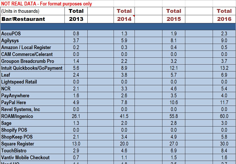 Date of publication September 1, 221 Mobile POS Software is one of the fastest growing areas in retail technology, but it is not growing at the same speed in all retail segments or even by the size of retailers. This research tracks the installs and shipments of software licenses in Mobile POS instances. It reviews the smaller retailers “mom and pop’s” that began the mobile POS trend and that are seeing tremendous technology disruption for traditional POS terminals. It also covers the forecast for the the fast rise in adoption of mPOS in the enterprise retailers. You would use this research to answer the following questions? How big is this market? How fast is it growing? Which vendors are winning? How much share does Square, Level Up, Shopkeep have? Are these vendors doing better than Enterprise vendors like Oracle, Toshiba and Starmount? How does the market growth differ for Enterprise verses SMB? This research will tell you. This research provides shipments and installed base on a quarterly and annual basis for vendors such as Square, Intuit, Shopify, Level Up, First Data, Paypal, Revel, NCR and Pay Anywhere at the SMB level, then Oracle, Infor, NCR, Aptos, Toshiba, and many others for use of mobile devices for POS. We look at shipments and installed base by segment and tier. Below in the Product Highlights section we get into the details of the data available. The Preview tab gives you some pictorial examples of the types of data available. This data is meant to be used in conjunction with the Mobile POS Study which provides the qualitative background of the trends. It is in this study where we discuss trends, barriers to entry, and growth assumptions. The data here is purely quantitative in nature. We are thankful to the vendors who participate in sharing data points to make this as accurate as possible. The data is customized for segment or if SMB or Enterprise. The pricing ranges from $1,500-$6,000 depending on the segments chosen. Highlights Initially this Mobile POS Software Share is focused only on the North American market. The data is provided with Shipments and installed base with the following roll-ups
