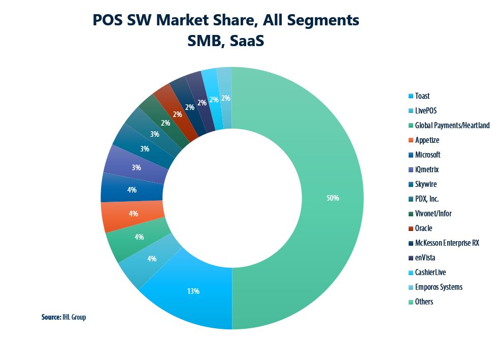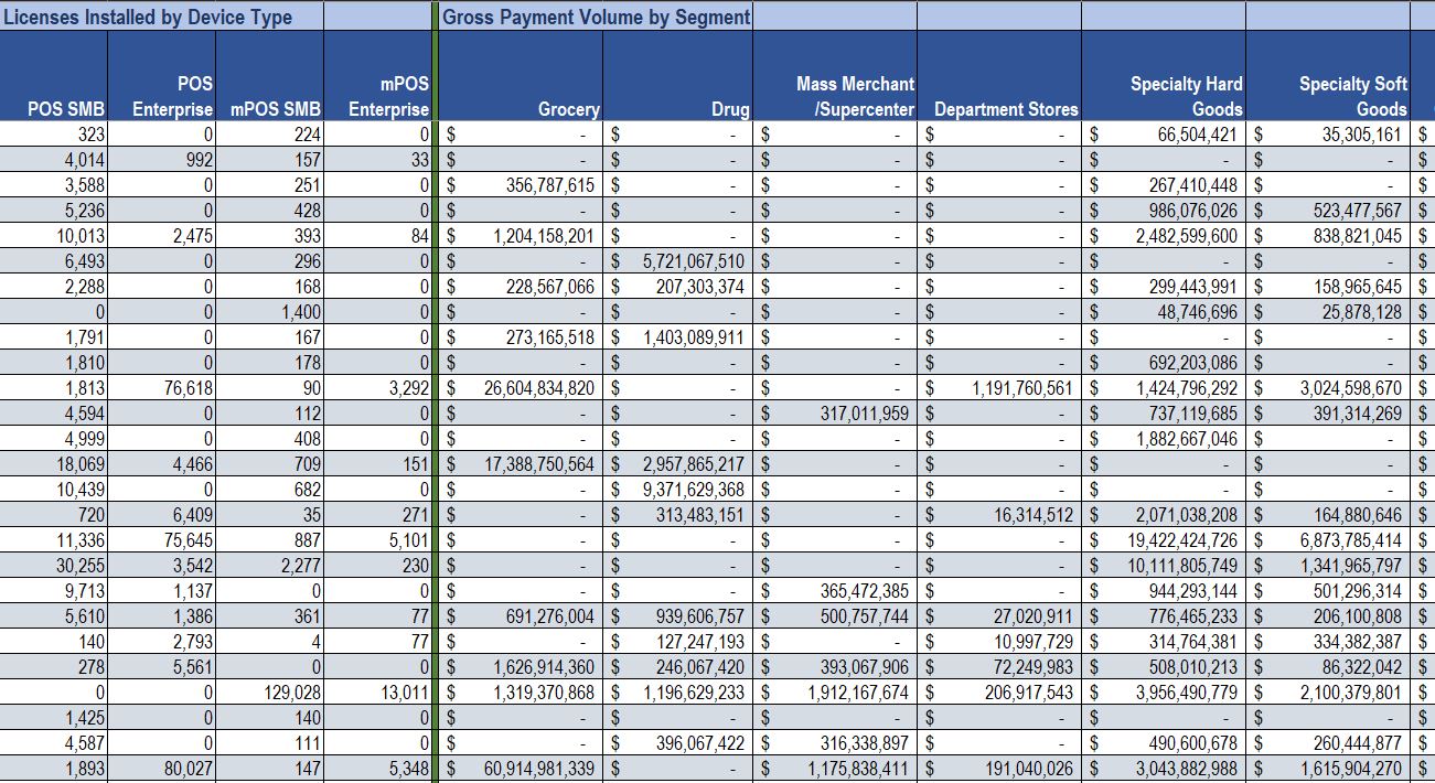 For each company, we look at their overall business, Total revenue, maintenance revenues, licenses outstanding, and Gross Payment Volume through their systems installed. We look at the data for Enterprise-level retailers by segment (retailers with 50 or more stores) and then SMB (below 50 stores) and this data is broken down by 13 different segments.