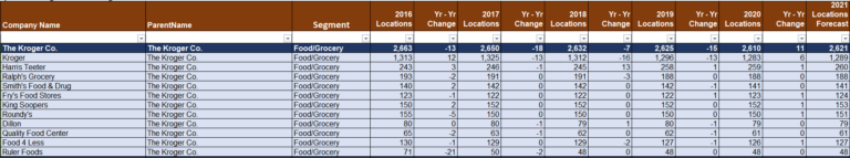 Food/Grocery (Kroger, Safeway, Trader Joe’s, Wakerfern) Preview Here is a sample of the output. The dark blue is the line for a parent company. The lighter blue are the subsidiaries.