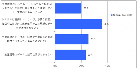 生産現場のデータ(OTデータや製造IoTデータ)の利活用状況を製造業単独で見てみると、「システムは連携していないが、必要な都度、経営や生産以外の業務部門で生産現場のデータが活用されている」が最も多い35.6%となっており、もっぱら都度的な利用に終止しているようにみえます。「生産現場のデータは、経営や生産以外の業務部門では全く活用されていない」または「生産現場のデータの活用状況がわからない」と回答した製造業は半数近くに上り、製造業における生産現場のデータ利活用は思うように進んでいないようであることがわかりました。製造業では保有するデータの種類が多く、複雑性も高いという困難な背景があることは確かですが、この結果を見るかぎり、生産現場のデータ利活用が「個々の工場の現場まかせ」になっていることが危惧されます。