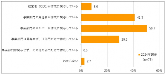 データアーキテクチャの策定には経営および事業部門の知見が必要です。今回の調査でデータアーキテクチャの策定に事業部門の責任者またはメンバーが参画していると回答した企業は半数近くに上り、逆に IT 部門のみで策定している企業は約3割にとどまっています。データアーキテクチャの策定へ参画する事業部門のウェイトが高くなってきたことが伺えます。