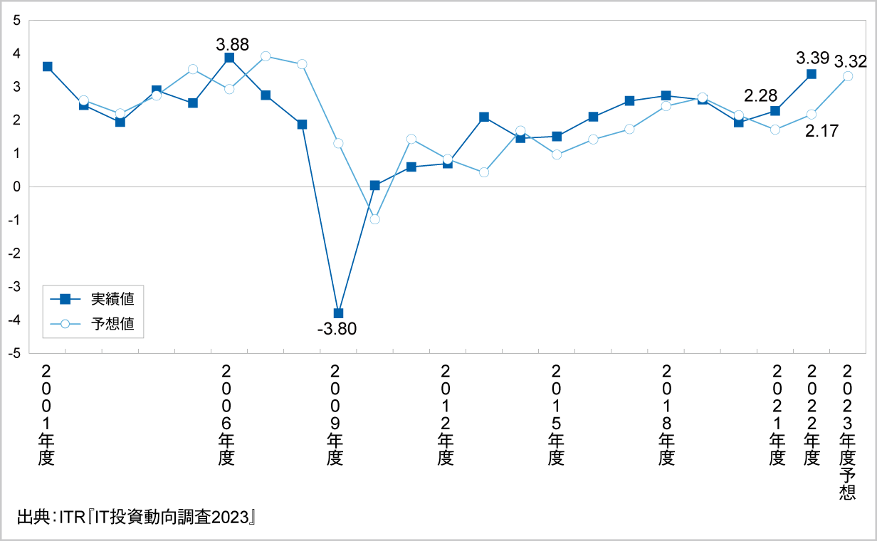 この増減傾向を指数化した「IT投資インデックス※1」を見ると、2022年度の実績値は3.39と2年連続で上昇し、2006年度以来の3ポイント台と高い値になり、IT予算の増額に前向きな姿勢が示されました。また、2023年度の予測値は3.32となり、2022年度とほぼ同水準のIT投資意欲が維持されると見られます。コロナ禍によるビジネス環境の変化とDXに対する意欲の高まりがIT投資の増額を後押ししていると推察されます。