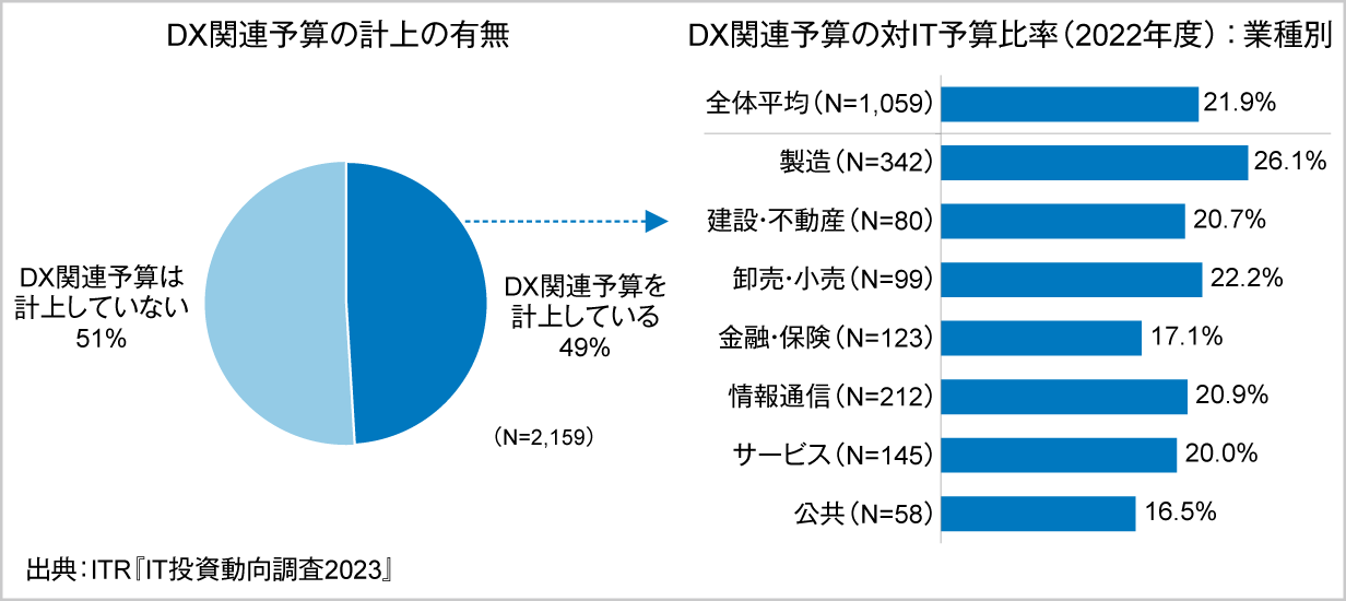昨今の企業でのDX推進の動きを受け、DX関連予算について尋ねたところ、同予算を計上(他予算からの案分を含む)している企業は全体の約半数に上りました。また、それらの企業でのDX関連予算のIT予算に対する比率の平均値は21.9%となり、同比率が25%未満とする企業は約7割を占めました。業種別では、「製造」でのDX関連予算のIT予算比率が最も高く、「公共」と「金融・保険」が20%を下回る結果となりました。
