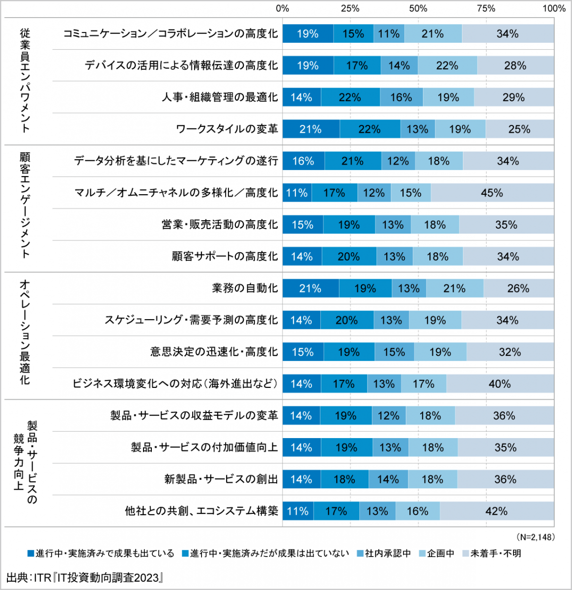企業におけるDX推進に向けた具体的な施策の進展状況を確認すべく、DXに関する16項目のテーマへの取り組み状況を尋ねました。その結果、ほとんどのDXテーマで、前年の調査結果に比べ成果が出ている企業の割合が微増したことを確認できました。なかでも「ワークスタイルの変革」と「業務の自動化」については、成果が出ているとした企業が2割を超えました。全体としては、進行中か実施済みだが成果は出ていない企業が2割前後、社内承認中または企画中である企業が3割前後というテーマが多いことから、企業のDXへの取り組みは、ようやく成果獲得に向けて実践フェーズに入るところであるといえるでしょう。