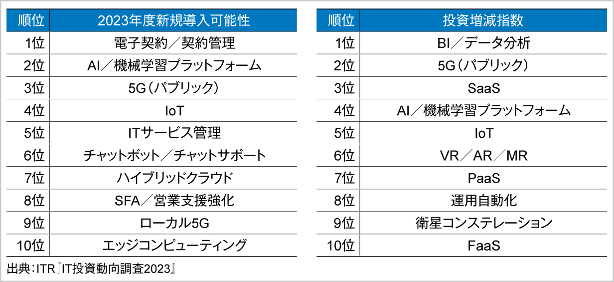 その結果、2023年度の新規導入可能性は、前年の調査結果と同じ「電子契約/契約管理」が1位に、投資増減指数は前年2位であった「BI/データ分析」が1位となりました。新規導入可能性では、この他「AI/機械学習プラットフォーム」「5G(パブリック)」「IoT」が上位にあがり、これらの3つは投資増減指数においても5位以内に位置し、未導入/導入済み企業ともに2023年度に投資意欲が高まることが見込まれます。一方、コロナ禍によって投資ニーズが急拡大した「ビデオ会議/Web会議」などの在宅勤務対応のIT投資は落ち着くと見られ、2023年度に向けてはデジタルビジネスと関連性の高い製品・サービスへの投資にシフトするでしょう。