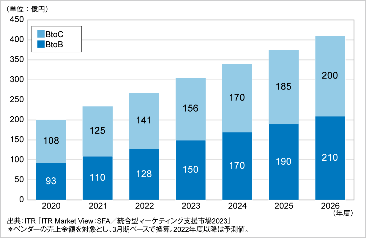 図.統合型マーケティング支援市場規模推移および予測:BtoB、BtoC別
