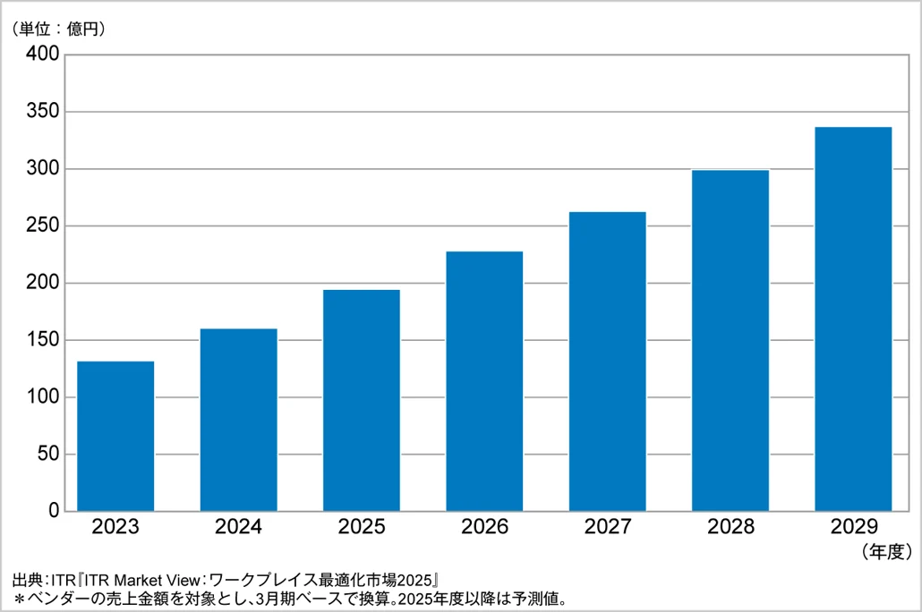 アイ・ティ・アールの発行する「ITR Market View:ワークプレイス最適化市場2025」は、ワークスペース管理市場、来訪者管理システム市場、従業員エンゲージメント市場、ユニファイド・エンドポイント管理市場の全4分野を対象に、国内28ベンダーへの調査に基づいた2023-2024年度売上げ実績および2029年度までの売上げ予測を掲載しています。