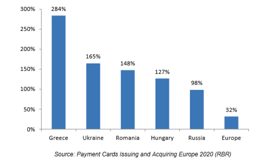 Russian cards see the lowest average ticket in Europe, at €12, while the number of payments in the country nearly quadrupled over four years. Whilst this echoes the general pattern seen elsewhere in Europe, in Russia in particular this has been driven by initiatives such as contactless ticketing on the Moscow and St. Petersburg metro systems, and lucrative cashback reward schemes, offered by a number of banks, incentivising use of cards ahead of cash. Increased debit card spending drives overall growth RBR’s research shows that the vast majority of markets in Europe have seen an increase in the proportion of spend made with debit cards. There has been a widespread consumer shift from pay-later credit cards to pay-now debit cards, as a result of economic uncertainty and increasing consumer frugality. RBR found that this shift is most stark in Greece, with debit growing from 26% of the country’s card expenditure in 2014 to 68% in 2018.