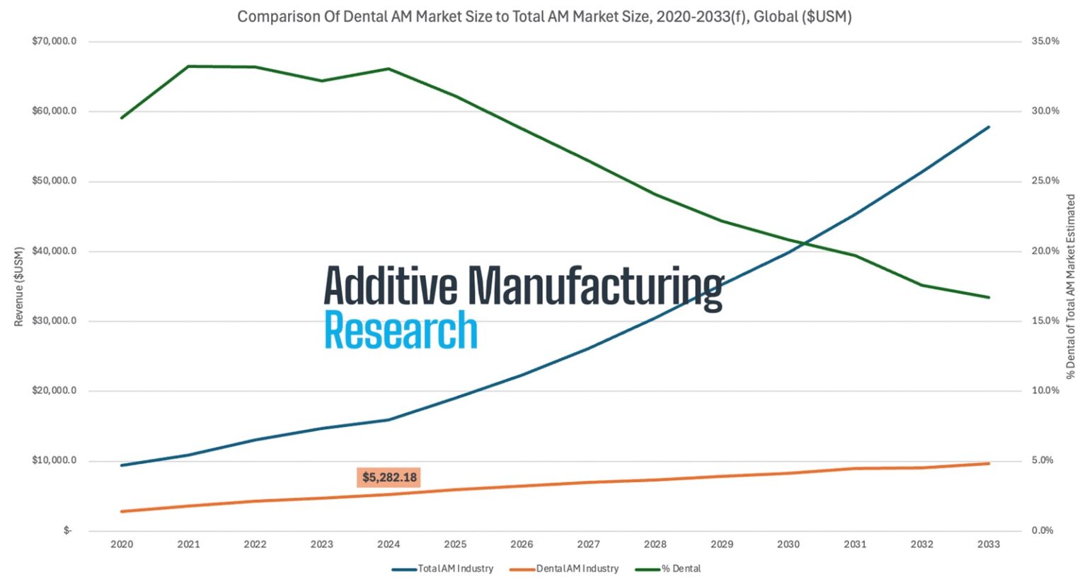 New York, NY: Additive Manufacturing Research (AM Research) has published a new iteration of a flagship report, "3D Printing in Dentistry 2025: Market Study & Forecast". This report represents the latest findings and trends in the dental printing market outlook from AM Research. The accompanying database of market data and forecasts is updated with the latest impacts from innovations, adoption rates, and challenges in each technology process, dental segment, and region. Comparison of Dental AM Market Size to Total AM Market Size, 2020-2033(f), Global($USM)