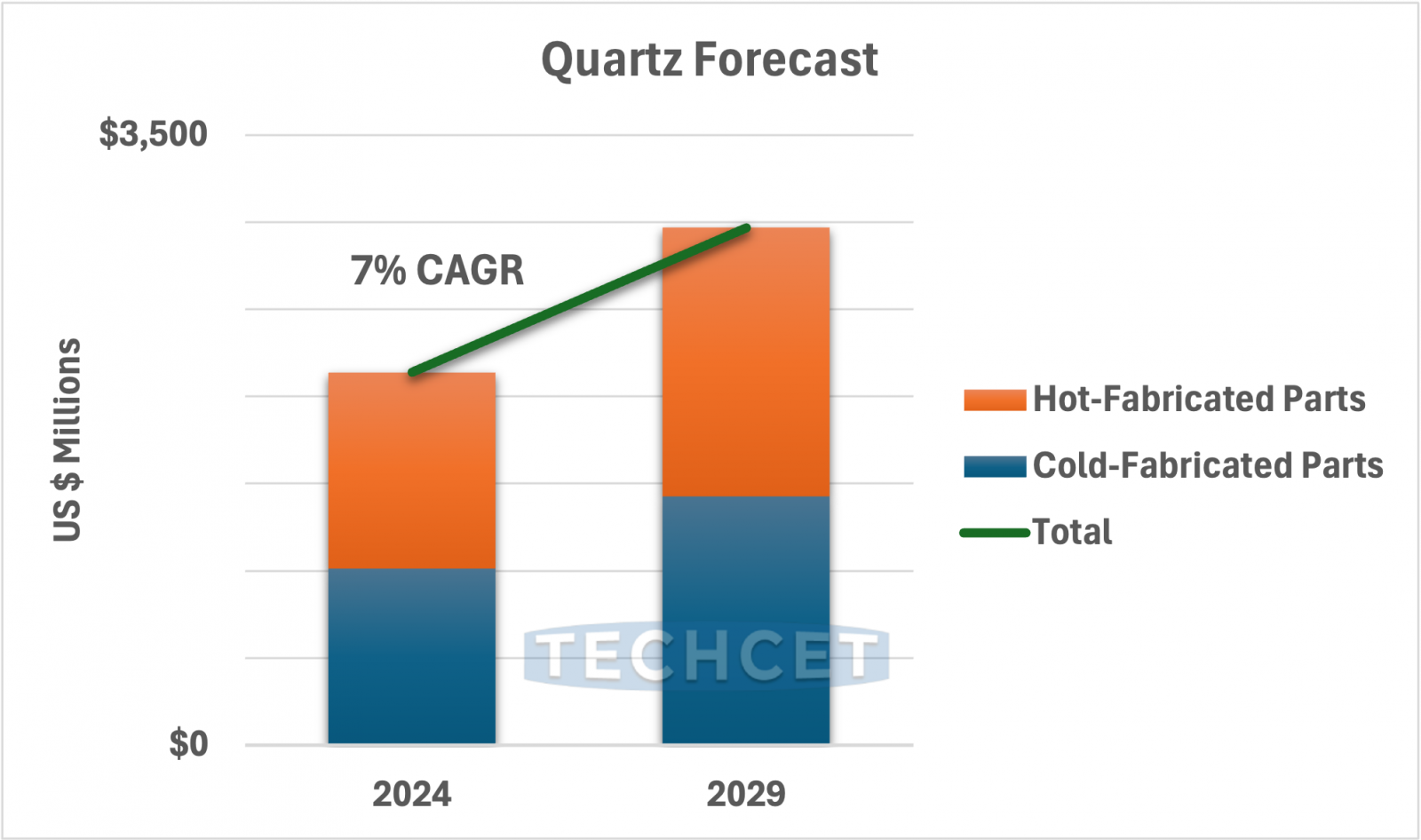 This report covers the market and supply-chain for Quartz Fabricated Parts used in semiconductor device fabrication, and the supporting supply chain. The report contains data and analysis from TECHCET’s data base and Sr. Analyst experience, as well as that developed from primary and secondary market research. Topics include High Purity Fabricated Quartz Parts market, supply chain from raw sand/powder, and base materials. Effort has been made to provide breakdown of the supply and market by supplier as well as region. Forecasts are based on semiconductor wafer starts growth and equipment systems forecast as well as technology developments and regional dynamics.